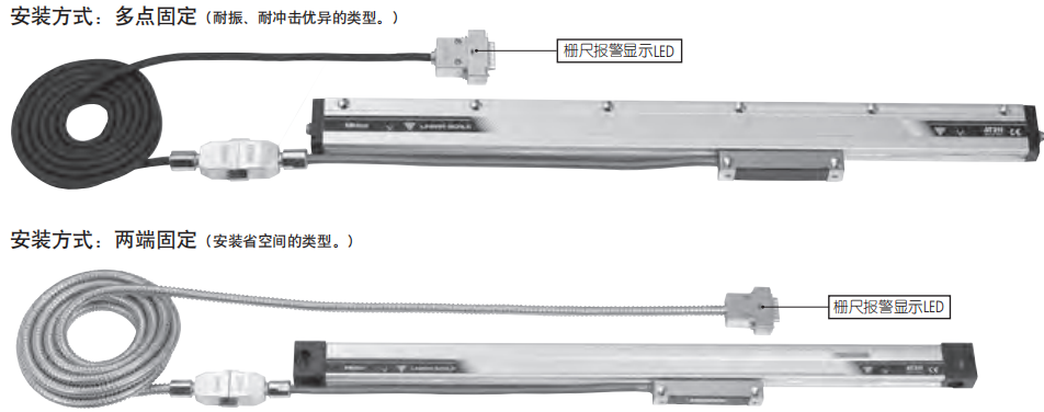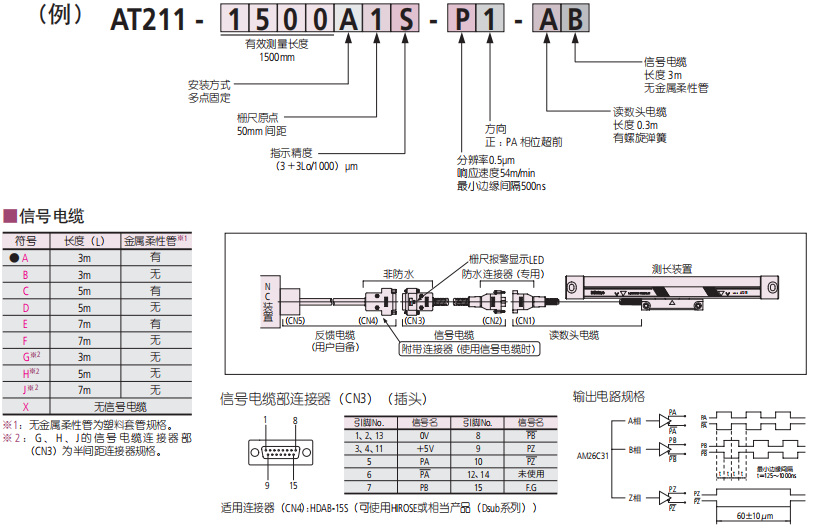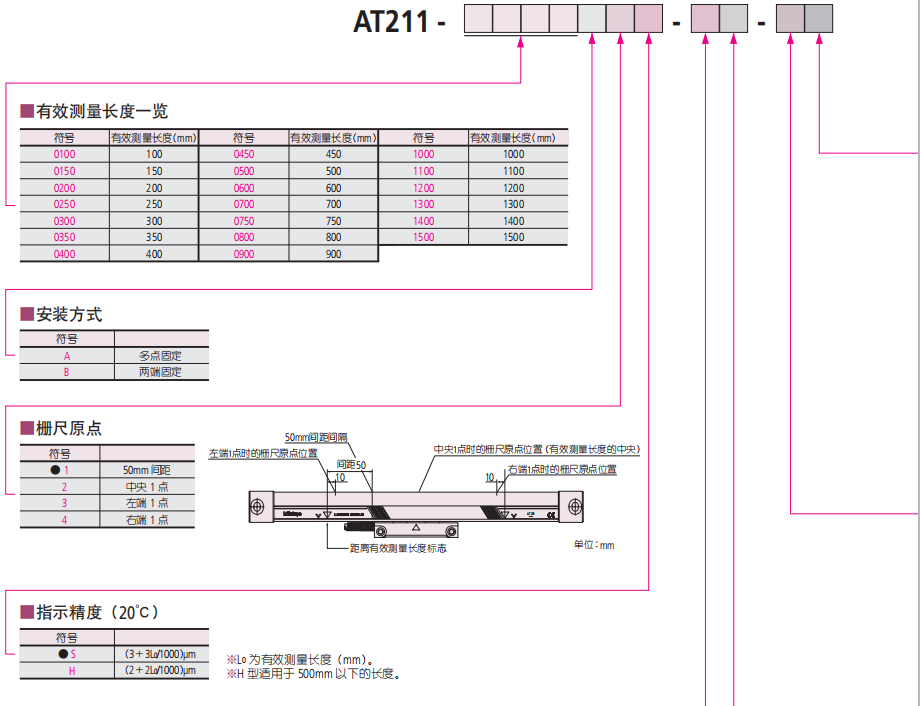 產品介紹AT211系列光柵尺方波輸出型(細長高速型)高精度光柵尺2um/m 產品特點: 1.高精度, 高分辨率封裝型光柵尺,是半導體加工系統和CNC機床在定位時進行反饋控制的理想工具。 2.兩種型號可供選擇:AT211A多點安裝型,增強了防震性能。AT211B可安裝在機床兩端。AT211B的尺寸與 AT111細長型相同。 3.可直接連接控制裝置的細長型屏蔽型光柵尺。 4.支持0.1-5um的大范圍分辨率,可實現120m/min的高速響應 5.多點固定型是實現了高耐振性的規格4.配備光柵尺報警顯示功能,易于維護 6.可根據使用目的選擇光柵尺的增規格項目選擇方式 技術參數: