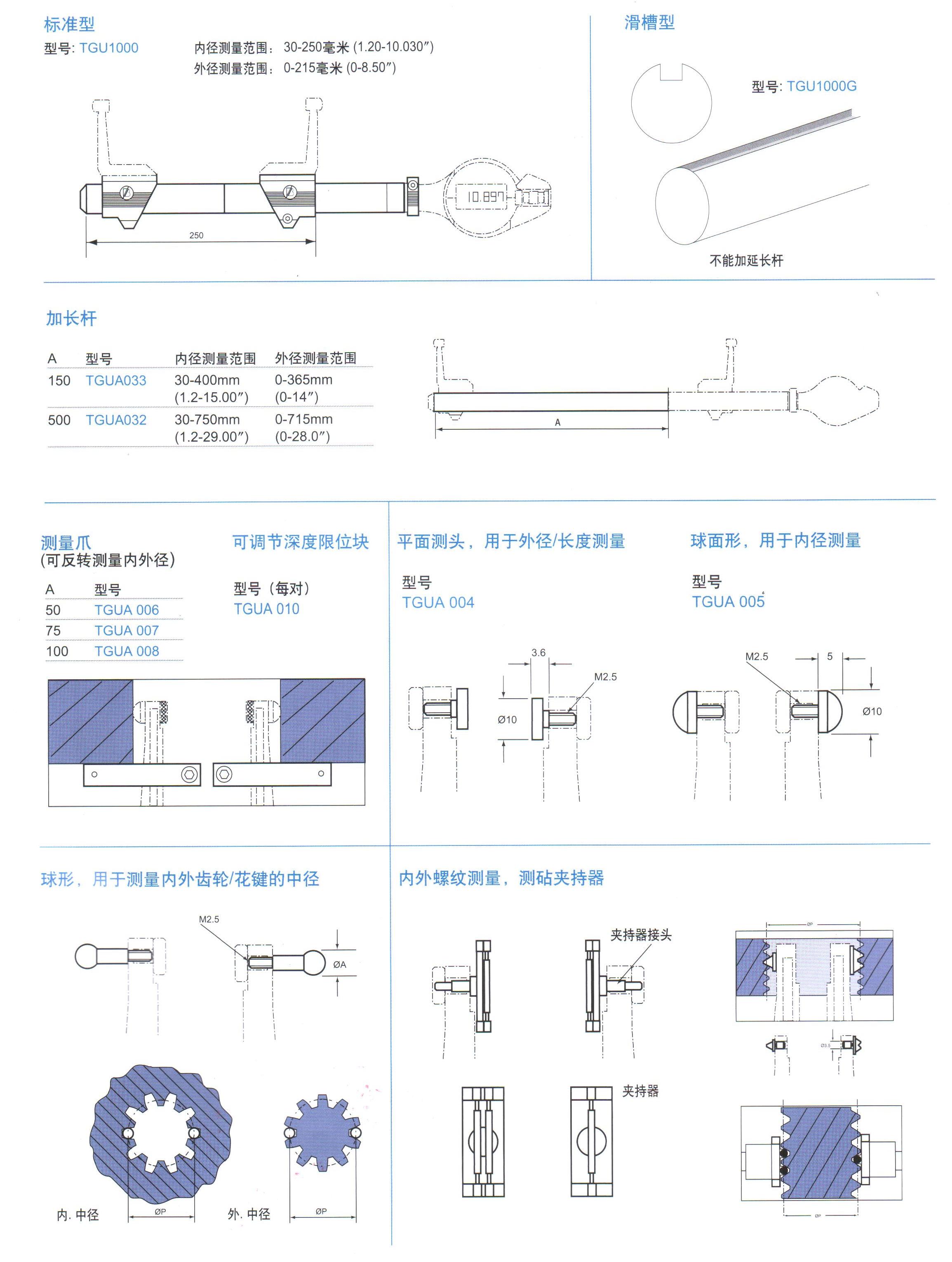 • 各種附件齊全,可進行多種測量如螺紋,直徑,長度,凹槽,花鍵等