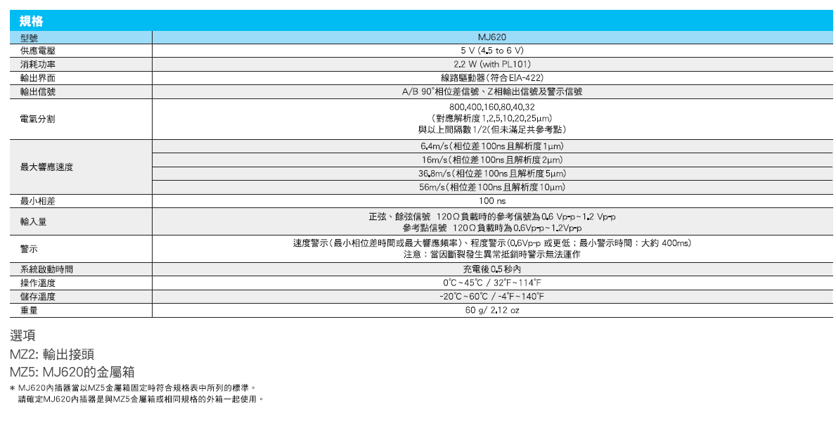 MJ620內(nèi)置接收器, 可從差分線路驅(qū)動器產(chǎn)生A/B相90°相位差信號, AZ相位輸出信號及警示信號; 細分數(shù)最大800; 響應速度最大56m/s; 最大相位差100ns; 配用產(chǎn)品:PL101,MZ2,MZ5,SL700。 品特性: 產(chǎn)品特性: MJ620內(nèi)置接收器 適用于各種工廠作業(yè)環(huán)境,耐油水灰塵,抗震動沖擊能力強