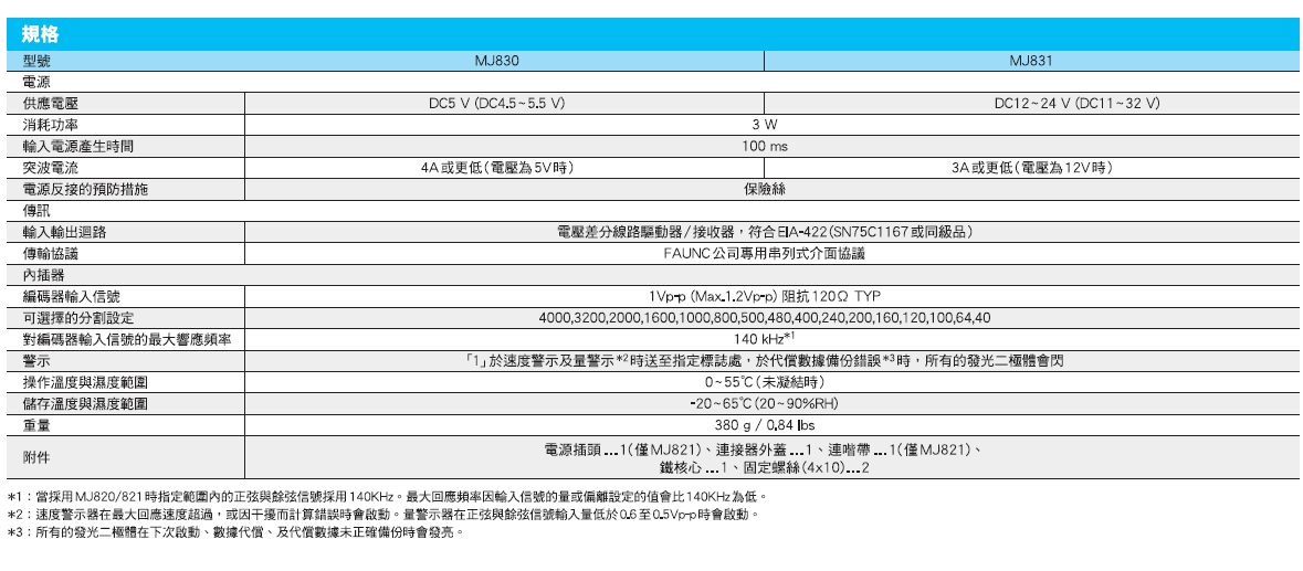 產(chǎn)品介紹簡單介紹: 用于三菱MR-J2超級系列放大器的內(nèi)插器MJ830/MJ831 信號轉(zhuǎn)換器放大器MJ830/MJ831; 允許直流補償、增益補償、相位差補償, 配用產(chǎn)品:PL101,SH12及通用類似輸出編碼器。 適用于三菱公司專用串列式介面協(xié)議。特性: 產(chǎn)品特性: 用于三菱MR-J2超級系列放大器的內(nèi)插器MJ830/MJ831 輸入阻抗 Input impedance:120 Ω 差動輸入電壓 voltage differential input:1 Vp-p 最高響應(yīng)頻率Max. response frequency:140 kHz for any number of divisions selected 電源 Power supply:MJ830 DC 5V(4.5-5.5V);MJ831 DC 12V-24V(11V-32V)