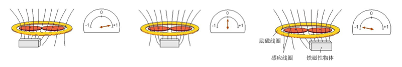 感應式柵尺是一款區別于光柵和磁柵的測量系統。其主要測量原理是差動感應傳感(互感式)原理,將被測位移量轉換成線圈的互感的變化。讀數頭的初級線圈是勵磁線圈,當在勵磁線圈中通入1.3MHz的高頻電流時,勵磁線圈內部的磁通量是始終變化的。感應線圈(次級線圈)為一組2個參數完全相同且極性相反的串聯的線圈,如果對稱的兩個感應線圈(內部的圓環)內部分布的磁場大小相同,則感應線圈的感應電壓輸出為零。但是當一個鐵氧體或導體(尺帶或者碼盤)進入到感應線圈的磁場中時,會使感應線圈內部的磁場空間上強弱分布不同,這樣感應線圈因為感應到的磁場強度不同,就產生了感應電壓的變化。感應電壓的大小隨外界鐵氧體或導體進入的位置不同而產生幅值上的變化,通過感應線圈上產生的感應電壓幅值變化可以對鐵氧體或導體的位置進行檢測(即感柵尺移動的位置)。請參考下圖1-1 。